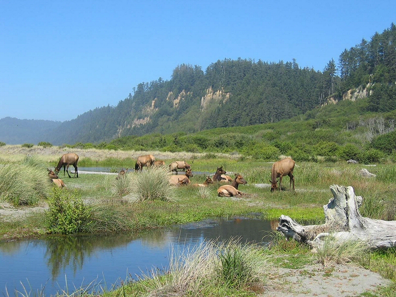 Elk Prairie Plus de 40 espèces de mammifères sont recensées dans le parc naturel, parmi lesquelles l'ours noir, le puma, le lynx, le coyote, le castor, la loutre de rivière, le daim, et le wapiti (elk en anglais), que l'on peut voir dans Prairie Creek Redwoods State Park, le long de l'U.S. 101 (ces prairies offrent au gibier une nourriture abondante). La faune est composée également de loutres, saumons, truites, pélicans et oies du Canada. Le parc abrite une abondante végétation dont des fougères et des rhododendrons (qui fleurissent en mai et juin au pied de certains séquoias) et atteignent ici une taille hors du commun. Cliquer sur l'image pour l'agrandir. |