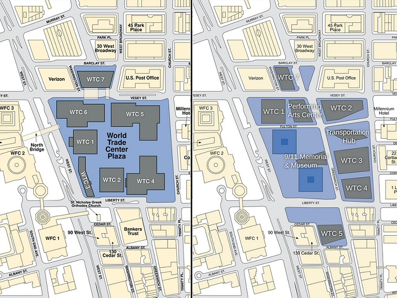 L'ancien World Trade Center (1966-2001) Situé au sud de Manhattan, le World Trade Center était un complexe de sept immeubles d'affaires, célèbre pour ses deux gigantesques tours jumelles appelées Twin Towers. Inaugurées en 1973, elles étaient les plus hautes tours de New York (et du monde jusqu'à la construction de la Sears Tower de Chicago la même année) et culminaient à 417 mètres. 50.000 personnes y travaillaient quotidiennement. Le 11 septembre 2001, quatre avions de ligne américains sont détournés par des pirates de l'air. Deux d'entre eux s'écrasent contre les tours du World Trade Center qui s'effondrent quelques minutes plus tard. 2749 personnes trouveront la mort lors de ces attentats suicide fiche info. Après ces attentats, l'emplacement du World Trade Center fut appelé Ground Zero ("Niveau Zéro"). Cliquer sur le lien en bleu ci-dessus pour en savoir plus sur l'ancien World Trade Center. |