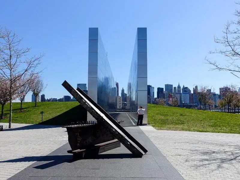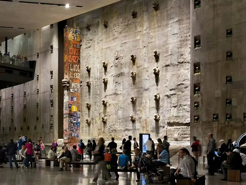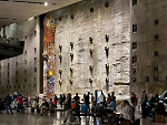 Musée du 11 septembre Le musée (entrée à droite de l'Oculus sur la photo), dont la majeure partie de la superficie se trouve sous le mémorial (sur 7 étages), est ouvert depuis le 21 mai 2014, après 8 ans de travaux et de nombreux retards liés à l'ampleur de la tàche (sans compter l'inondation causée par l'ouragan Sandy). Plusieurs manifestations ont également eu lieu, les familles des victimes s'inquiétant de voir le musée devenir une attraction touristique qui n'aurait pas été respectueuse du lieu. Le musée renferme de nombreux objets personnels retrouvés dans les décombres (chaussures, lunettes, sacs, portefeuilles, cartes d'identité), ainsi que des débris des tours jumelles (dont une énorme colonne d'acier de 11 mètres de haut, la dernière récupérée sur le site en mai 2002), ou encore des véhicules endommagés (taxi et camion de pompiers photo partiellement écrasés). Il y a également un immense mur où sont affichées les photos des victimes des attentats. Plus loin, on entend des extraits sonores des conversations entre sauveteurs, ou des appels passés par des gens qui étaient coincés dans les tours. Parmi les éléments spectaculaires, citons la vue sur le Foundation Hall depuis le haut du musée sur un énorme segment du mur de soutènement (photo ci-contre) construit pour protéger le sous-sol des infiltrations d'eau (la rivière Hudson passant non loin du site), et sur une énorme poutre du World Trade Center érigée en totem recouvert d'inscriptions gravées par les secouristes et ouvriers qui ont déblayé les décombres de . On passe également à côté du survivors' stairs photo (ce qui reste des escaliers empruntés par des centaines de survivants dans leur fuite) ou encore d'un segment de l'antenne photo qui se trouvait au sommet de la tour nord. Dans l'exposition historique sont expliqués le contexte des attaques, le récit chronologique des évènements du 11 septembre et ses conséquences, avec de très nombreuses photos des tours en feu et des New-Yorkais sous le choc, des extraits des journaux télévisés et papiers, ... Le musée est ouvert de 9h à 19h (dernière admission à 17h30). Il est généralement fermé les mardis (sauf à certaines dates). L'entrée coûte $36 (tarif 2026). Il est possible d'obtenir des tickets gratuits pour une entrée le lundi à partir de 17h30 (se connecter sur le site internet officiel à 7h pour tenter d'en obtenir, premier arrivé, premier servi). Site officiel : http://www.911memorial.org (en anglais). Cliquer sur l'image pour l'agrandir. |