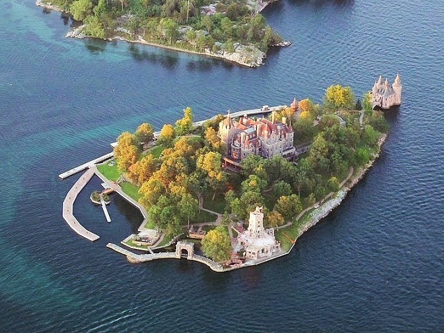 Boldt Castle, sur Heart Island La petite île de Heart Island ("l’île du Cœur") est probablement le site le plus célèbre et le plus visité de la région des Mille-Iles. C’est George C. Boldt, un immigrant d’origine prussienne ayant fait fortune dans l’hôtellerie, qui acheta l'île en 1895 en vue d'y construire un château qu'il voulait offrir à sa femme. La construction de son palais de six étages (120 pièces), sur le modèle des châteaux européens du 16ème siècle, nécessita près de 300 ouvriers et l’ouverture de plusieurs carrières de granit sur des îles alentours. Le projet coûta la somme astronomique pour l'époque de 2,5 millions de dollars. Alors que la construction était presque achevée et que Boldt était sur le point d’offrir le magnifique château à sa femme Louise en guise de cadeau de Saint Valentin, cette dernière trouva tragiquement la mort. Boldt, le cœur brisé, ne remit jamais les pieds sur l’île et fit cesser la construction du château, l’abandonnant aux vandales et aux caprices de la météo. Le rêve inachevé tombe en ruine jusqu’à ce que l’Administration du pont des Mille-Iles (Thousand Island Bridge Authority) en fasse l’acquisition en 1977 et débute un immense chantier de restauration. Cette tragique histoire d’amour n’empêche pas d'attirer chaque année un grand nombre de jeunes couples qui choisissent de se marier sur l'île. La quasi-totalité de ce luxueux château est par ailleurs accessible aux visiteurs. Ne manquez pas la verrière Tiffany qui coiffe l’escalier en marbre, ou la salle à manger qui offre une superbe vue sur le fleuve. A l'extérieur, sur les berges, le petit château médiéval photo camoufle la centrale énergétique chargée de fournir la demeure principale en eau et électricité. Sur l'île toute proche de Wellesley Island, l'extraordinaire hangar à bateau (The Boldt Yacht House photo), dont la structure métallique est recouverte de bois, abrite Louise, un yacht à vapeur de plus de 30 mètres ainsi qu'un atelier de réparation doté d'un système permettant de sortir les bateaux au sec). L'île est accessible de mai à octobre. Des visites non-guidées permettent de promener à son propre rythme. Notez que l'entrée du château ($9,5 pour le château, $5 pour le Yacht House, ou $12,50 pour les deux, tarif 2018) n'est généralement pas comprise dans le prix des croisières dans les Mille-Iles. Par ailleurs, l'île se trouvant côté américain, gardez votre passeport avec vous si vous arrivez du Canada, et pensez à remplir le formulaire ESTA sur Internet, obligatoire pour tout ressortissant français se rendant aux USA (voir ma page Conseils rubrique "Visa"). Pour en savoir plus : http://www.boldtcastle.com (en anglais) Cliquer sur l'image pour l'agrandir. |