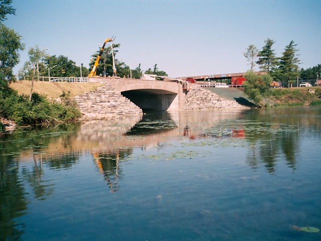 Thousand Islands Bridge Situé à une demi-heure de Kingston, à l'est de la ville de Ivy Lea , le pont des Mille-Iles surplombe le Saint-Laurent et permet de relier l’Ontario (Canada) à l'état de New- York (Etats-Unis). La construction de l'ensemble du système du pont (constitué de 5 sections, qui s'étalent sur 13,6 kms) n'a duré que 18 mois (de mai 1937 à août 1938), un record pour l'époque. Coté canadien, il est constitué d'un pont suspendu de 228 mètres entre les piliers (et culminant à 36,5m au-dessus du fleuve) reliant le continent à l'île Georgina, d'une arche en acier de 106 mètres reliant Georgina Island et Constance Island, ainsi que d'une travée de 183 mètres reliant l'île Constance à Hill Island. Pour passer la frontière entre le Canada et les Etats-Unis, il faut franchir le minuscule chenal qui sépare Hill Island et Wellesley Island sur ce qui est sans doute le plus petit pont international du monde photo (27 mètres seulement). Un poste de douane se trouve de chaque côté. A l'origine, il n'y avait qu'un seul pont à la frontière, mais l'augmentation du trafic a nécessité la construction d'une travée parallèle en 1959. En effet, alors que le trafic lors des toutes premières années d'exploitation s'élevait à environ 150.000 passages par an, il atteignait en 1960 près de 750.000 véhicules, pour dépasser les 2 millions aujourd'hui. Un autre pont suspendu, dont la travée principale mensure 244 mètres, permet ensuite de rejoindre le continent américain en surplombant le fleuve de plus de 45 mètres. Sur ces différents ponts, un passage est réservé aux piétons. Pour en savoir plus : http://www.tibridge.com (en anglais) Cliquer sur l'image pour l'agrandir. |