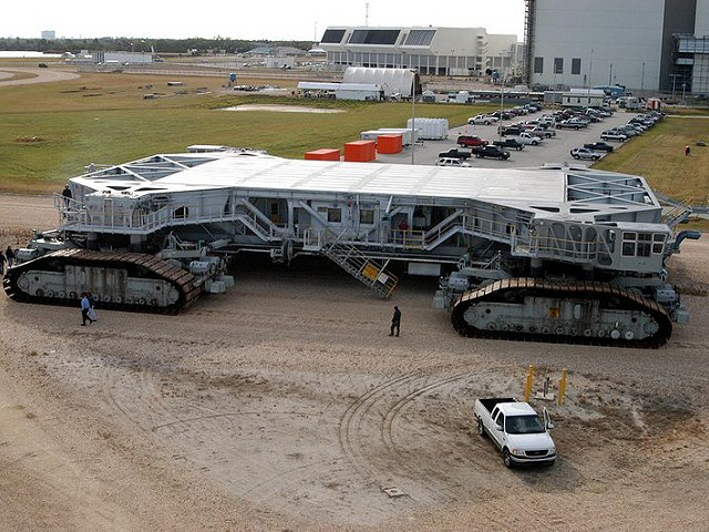 Transporteur à chenilles (crawler) La tâche du crawler est de transporter la navette spatiale assemblée au pas de tir et de renvoyer la plateforme mobile de lancement vide au Vehicle Assembly Building après le lancement. A l'origine, les deux transporteurs à chenilles ont été construits (sur le centre spatial) pour le transport des tours de lancement des fusées Saturn V. Le premier crawler fut assemblé en novembre 1964 et les tests finaux eurent lieu en mars 1965. Les deux furent mis en service début 1966. Le crawler est un engin énorme, qui fait partie des plus grands véhicules mobiles au monde : il mesure 40 m de long sur 35 de large (une superficie égale à la moitié d'un terrain de football), 6 mètres de haut en position basse (jusqu'à 8 mètres en position haute), pèse 2721 tonnes et peut en transporter plus de 6500. La plateforme rectangulaire est mue par 4 bogies à 2 chenilles chacune photo, chaque chenille comptant 57 patins de 900 kg. Ces chenilles, de 3 mètres de haut pour 12 mètres de long sont actionnées par 16 moteurs électriques alimentés par 2 moteurs diesels de 2750 chevaux. La consommation de gasoil s'élève à 350 litres au km. La vitesse normale d'un transporteur à chenilles lorsqu'il transporte la navette est d'environ 1,6 km/h (le double à vide). La conduite d'un tel monstre demande une patience extrême, spécialement lors des opérations de charge et de décharge à la fin du voyage. Deux cabines, à l'avant et à l'arrière permettent le pilotage du crawler. L'équipage conduit le crawler en s'aidant de jauges, de lignes et du jugement des techniciens placés dans les endroits stratégiques et munis de talkie walkies, pour aligner à cinq centimètres près les énormes chenilles. Le déplacement du crawler nécessite un équipe d'une trentaine d'hommes. Le trajet demande 5 à 6 heures pour franchir les 5600 mètres séparant le VAB du pas de lancement le plus proche. Une des caractéristiques principale du crawler est son système hydraulique qui lui permet de transporter la navette sur la pente à 5% photo du pas de lancement tout en conservant la navette parfaitement de niveau. Le Kennedy Space Center utilise les 2 crawlers d'origine (modernisés avec notamment l'ajout d'une visée laser permettant au conducteur de se positionner à plus ou moins 2 cm sous la plateforme). Ils seront modifiés pour supporter le poids encore plus important du nouveau lanceur Ares V qui doit remplacer la navette. Cliquer sur l'image pour voir plus de détails. |