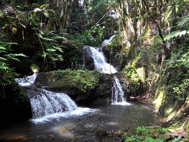 Pe'epe'e Falls & Boiling Pots Près du centre-ville d'Hilo, à 3 kilomètres environ après les Rainbow Falls (toujours sur la Wailuku River, qui avec ses 29 kilomètres, est la plus longue rivière d’Hawaii) se trouvent les chutes de Pe'epe'e Falls. En contrebas de la chute se trouve une série de bassins (Boiling Pots photo) où l’eau se fraye un chemin à travers les roches de lave solidifiée. Un sentier mène au bord de la rivière, mais il est dangereux de trop s’approcher à cause des tubes de lave dans laquelle l'eau s'engouffre (plusieurs noyades ont eu lieu à cet endroit). Cliquer sur l'image pour l'agrandir. |