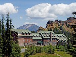 Crater Lake Lodge Le Crater Lake Lodge n’est ouvert que l’été à cause de la rigueur de l’hiver et l’abondance des chutes de neige à Rim Village. C'est à cause de ces conditions météorologiques extrêmes que la construction de l’hôtel, qui a débuté en 1909, n’était que partiellement terminée lors de son inauguration en 1915. Fermé en 1989 pour réfection complète (d’énormes travaux de reconstruction furent entrepris afin de lui donner son élégance rustique actuelle), il rouvrit ses portes en mai 1995. Il comporte 70 chambres avec vue soit sur le lac soit sur la vallée (voir plus bas : "Se loger"), et son salon photo renferme une gigantesque cheminée en pierres. Cliquer sur l'image pour l'agrandir. |