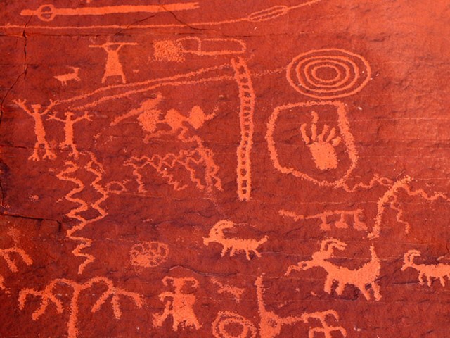 Atlatl Rock L'Atlatl Rock (l'atlatl était une arme de chasse destinée à propulser des flèches) est un énorme rocher sur lequel sont gravés un grand nombre de pétroglyphes photo. Une passerelle permet de les observer de près. Les plus anciens sont vieux de plus de 3000 ans. Le site de Valley of Fire fut occupé plus régulièrement de 300 avant Jésus-Christ jusque vers 1150, d'abord par des indiens Paiutes puis par les Anasazi. Ils vivaient de la chasse, de la cueillette, mais le manque d'eau dans cette région a certainement à l'origine de leur départ. D'autres pétroglyphes sont visibles à plusieurs endroits dans le parc (notamment - voir plus bas - dans Petroglyph Canyon). Cliquer sur l'image pour l'agrandir. |