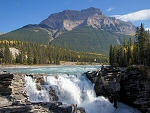 Athabasca Falls Les Highways 93 et 93A se rejoignent au niveau des chutes Athabasca Falls, à 30 kilomètres du sud de Jasper (30 mn de route). A cette endroit, la rivière Athabasca entre dans une gorge et en ressort 23 mètres plus bas, formant une large rivière aux eaux plus tranquilles. Plus que la hauteur, c'est la puissance de ces chutes (due à la grande quantité d'eau qui se déverse dans la gorge, même quand la rivière est à son niveau le plus bas) qui impressionne. Plusieurs terrasses et passerelles, proches de l'eau, offrent des points de vue spectaculaires. Le mot Athabasca signifie "où il y a des roseaux", en référence au delta marécageux formé par la rivière au niveau du lac Athabasca. Le mont et le glacier Athabasca doivent leur nom à la proximité de la source de la rivière Athabasca. Une dizaine de kilomètres plus loin, les "terres salines des chèvres", un terrain riche en minéraux, attirent les chèvres des montagnes. Cliquer sur l'image pour l'agrandir. |