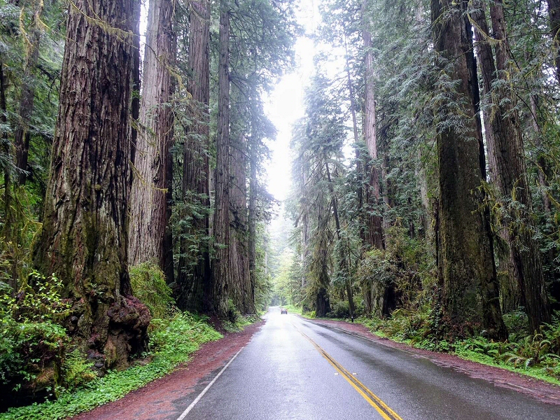 Newton B. Drury Scenic Parkway Cette route alternative à l'U.S. Highway 101, d'une quinzaine de kilomètres, serpente au milieu des séquoias centenaire que l'on reconnait à leur tronc dépassant le mètre de diamètre et dépourvu de branches sur le premier tiers de leur hauteur. Le Big Tree photo ("gros arbre"), situé dans Prairie Creek Redwoods State Park, est un des plus larges Redwoods et un des plus facilement accessibles (il se trouve en bordure de cette route). Sa hauteur est de 92,6 mètres, sa circonférence de 20,7 mètres, son diamètre de 6,6 mètres et son âge est estimé à 1500 ans. Ne cherchez pas dans ce parc de "point photo" où l'on peut passer en voiture sous un séquoia. Les seuls existants dans le secteur se trouvent sur des terrains privés dont l'accès est payant. Cliquer sur l'image pour l'agrandir. |