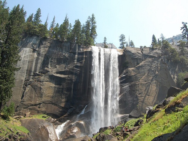 Nevada Falls Cette piste de 11 kilomètres aller-retour longe la Merced River qui coule au fond de la vallée de Yosemite. Elle part du Nature Center at Happy Isles et permet en trois heures d'atteindre le haut de la chute Nevada Fall (181 mètres de haut), qui fait partie des plus belles cascades du parc. Il s'agit d'une randonnée difficile nécessitant une bonne condition physique (on passe de 1230 mètres à 1800 mètres d'altitude). On peut admirer en chemin Vernal Fall photo (97 mètres). Cliquer sur l'image pour l'agrandir. |