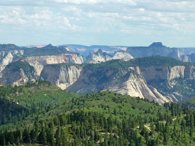 Kolob Canyons Viewpoint La superbe route Kolob Canyons Road photo longe une ligne de crête avant d'arriver à Kolob Canyons Viewpoint, d'où l'on a un point de vue sur les Kolob Canyons et leurs falaises aux couleurs rouges. De là part la piste de Timber Creek Overlook photo, un court sentier facile de 1,6 km aller-retour au bout duquel on pourra voir le secteur de Kolob Terrace (voir ci-dessous). Les canyons de Kolob ont été creusés par différents ruisseaux qui se jettent dans la Virgin River bien plus à l'ouest, hors des limites du parc. Cliquer sur l'image pour l'agrandir. |