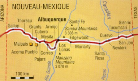 Etablie en 1706 sur le Rio Grande, à l'extrémité sud-est des montagnes Rocheuses, Albuquerque est la principale ville de l'Etat (500.000 habitants). L'ancienne route 66, nommée Central Avenue, est une rue rectiligne qui traverse la ville pendant 24 kilomètres ! La vieille ville, construite autour de la plaza et de l'église, est d'architecture espagnole (ce sont les espagnols qui ont été les premiers à s'installer ici et qui ont donné ce nom à la ville). Ce quartier abrite aujourd'hui plusieurs complexes commerciaux et de loisirs réservés aux touristes. Une fois par an, Albuquerque devient la capitale mondiale des montgolfières : l'International Balloon Fiesta réunit début octobre et pour une semaine des centaines de ballons (722 en 2002). A la sortie de la ville, la route grimpe la Nine Miles Hill (colline de 9 miles) du haut de laquelle on a une belle vue sur la vallée et le Rio Grande.