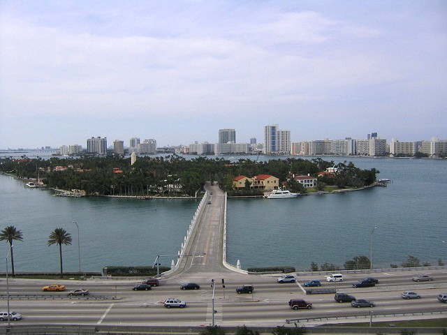 Venetian Causeway Bridge et Watson Island Cinq routes traversent la baie de Biscayne et relient Miami à Miami Beach, comme ici la Venetian Causeway (au premier plan). Sur cet axe, une série de 12 ponts permet de passer d'île en île (les Venetian Islands). Entre 1997 et 1999, de gros travaux de rénovation ont été entrepris. Si vous y passez de nuit, vous pourrez voir un peu plus au sud, le dessous du tablier du pont MacArthur Bridge (à droite sur la photo), éclairé en rose. Ce pont, tout comme l'île de Watson Island qu'il traverse, permettent d'avoir une belle vue sur Miami Downtown. Cette île artificielle, créée en 1931, accueille le parc de tropical Jungle Island (anciennement Parrot Jungle and Gardens) où vivent plus de 1000 espèces d'oiseaux (pélicans, flamands roses, marabouts et perroquets). On peut y assister à un spectacle de perroquets dressés. Cliquer sur l'image pour l'agrandir. |
