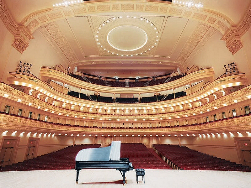 Carnegie Hall Le Carnegie Hall est une salle de spectacle mythique de Manhattan, connue pour son acoustique exceptionnelle. Elle est située à l'angle de la 57ème Rue et de la 7ème Avenue. De grands compositeurs et musiciens y ont joué, comme on peut le voir sur les portraits affichés dans les couloirs de l'établissement : les Beatles, les Pink Flyod, Maria Callas, Stravinsky, Frank Sinatra et bien d'autres. Le Carnegie Hall peut accueillir plus de 3600 personnes. Il comporte trois salles, chacune vouées à des utilisations différentes : le Main Hall, le Recital Hall et le Chamber Music Hall. La première est la plus grande, et celle où se jouent les concerts les plus populaires. C'était auparavant la salle officielle de l'orchestre philarmonique de New York. Le nom de la salle vient d'Andrew Carnegie, qui a financé la construction du lieu. Celle-ci a débuté en 1890, et le Carnegie Hall a ouvert l'année suivante, alors que les travaux n'étaient pas terminés (ils se sont achevés en 1897). L'intérieur photo vaut le coup d'œil. Le premier concert fut donné par le compositeur russe Tchaïkovski. Dans les années 1980, on ajouta une tour une tour à l'immeuble : on y trouve des boutiques et des appartements résidentiels. Site officiel : http://www.carnegiehall.org (en anglais). Cliquer sur l'image pour l'agrandir. |