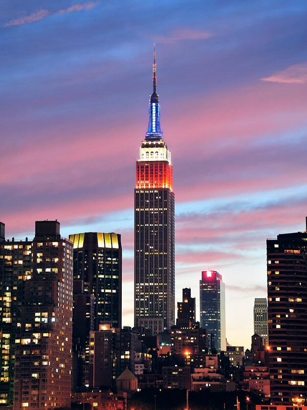 Les illuminations de l'Empire State Building Certains jours de l'année, des projecteurs illuminent le sommet de l'Empire State Building en fonction des différents événements du calendrier et de l'actualité. C'est une idée qui est venue de l'un des investisseurs du bâtiment. Ainsi, le gratte-ciel s'illumine des couleurs bleu, blanc, rouge, non seulement pour la fête nationale américaine (le 4 juillet), mais aussi pour la fête nationale française (Bastille Day). Pour Noël, on utilise le vert et le rouge (couleurs traditionnelles des fêtes de fin d'année) et lors du tournoi de tennis de l'US Open, il est éclairé en jaune pendant une quinzaine de jours (fin août-début septembre). Ce fut le cas également lors de la sortie du film "Les Simpson, le Film". En outre l'Empire State Building est parfois éclairé pour des événements exceptionnels. Ainsi, à l'occasion du 80ème anniversaire de Frank Sinatra, le gratte-ciel fut éclairé d'une lumière bleue, en référence au surnom de Sinatra, Ol' Blue Eyes. En 2001, après les attentats du 11 septembre, le bâtiment fut illuminé en bleu, blanc, rouge, les couleurs du drapeau américain, pendant plusieurs mois, avant un retour à la normale du calendrier des illuminations. Enfin, depuis l'élection du démocrate Franklin D. Roosevelt en 1932, la tradition veut que le jour de l'élection présidentielle, la célèbre tour adopte les couleurs des partis des deux candidats, bleu pour les démocrates et rouge pour les républicains, avant de prendre uniquement la couleur du parti vainqueur. Cliquer sur l'image pour l'agrandir. |