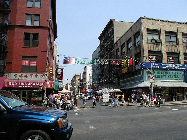 Chinatown New York abrite de nombreux quartiers où sont regroupés des communautés comme Little Ukraine, Little India, ou encore Chinatown. Ce dernier occupe une zone approximativement délimitée par Delancey Street au nord, East Broadway à l'est, Broadway à l'ouest et Chambers Street au sud. On y trouve une des plus grandes communautés asiatiques résidant hors d'Asie (depuis les années 1980, sa population a dépassé celle du quartier chinois de San Francisco). De 200 habitants en 1870, 7000 en 1900, on est passé aujourd'hui à une population estimée entre 150.000 et 250.000 résidents (difficile de la connaître avec exactitude, les habitants étant difficiles à recenser à cause de difficultés linguistiques et d'une importante immigration clandestine). Cependant, depuis quelques années, la communauté chinoise du quartier de Flushing dans le borough du Queens (voir plus bas), est devenue encore plus nombreuse (et pourtant moins connue). Chinatown est un quartier très animé et très coloré. Le dépaysement est tel qu'on en oublierait presque que l'on se trouve sur le continent américain. Les journaux sont en chinois, et les plaques donnent le nom de la rue d'abord en chinois, puis en petit en dessous, en anglais (de même pour certaines stations de métro). Les cabines téléphoniques sont en forme de pagodes, et certains bâtiments ont des façades dans le style chinois traditionnel. Le cœur de la communauté est Mott Street, bordée de restaurants (on en compte plus de 200 dans le quartier). On trouve également de nombreuses bijouteries (notamment sur Canal Street), des épiceries asiatiques à bas prix (c'est l'occasion de goûter aux spécialités culinaires locales), et de petits bazars qui vendent des produits asiatiques de toute sorte (baguettes, ...). A Chinatown, le jour de marché est le dimanche (sur Canal Street). Cliquer sur l'image pour l'agrandir. |