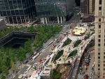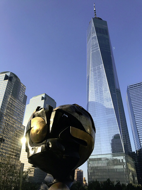 Liberty Park Inauguré en juin 2016, Liberty Park est un petit parc (4000m²) qui se trouve au sud du mémorial du 11 septembre 2001. Surélevé car situé sur le toit du Vehicular Security Center (le garage du World Trade Center), il offre un point de vue imprenable sur le site. Depuis août 2017, Liberty Park accueille The Sphere photo, une sculpture haute de 7,62 mètres, réalisée par l'allemand Fritz Koenig, qui trônait depuis 1973 au pied des tours jumelles du World Trade Center. Extirpée des décombres, elle fut très abîmée par l'effondrement des tours, mais pas détruite. Elle était installée depuis mai 2002 dans Battery Park, où elle faisait office de monument commémoratif en hommage aux victimes. En 2012, il fut envisagé de l'enlever pour permettre la rénovation de Battery Park, mais elle fut sauvée grâce à une pétition. Dans le prolongement de Liberty Park, vous pouvez également voir les travaux de l'église orthodoxe St. Nicholas, toujours en cours de reconstruction (mais pas à l'identique) après avoir été elle aussi détruite lors de l'effondrement des tours. Comme pour l'Oculus (voir ci-dessus), c'est architecte espagnol Calatrava qui a dessiné ce nouveau projet. Cliquer sur l'image pour l'agrandir. |