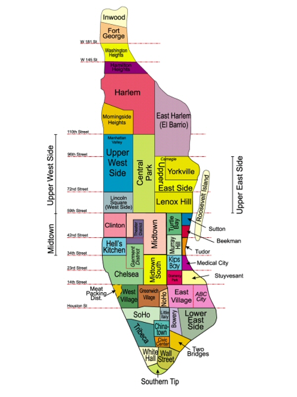 East Village L'East Village se trouve à l'Est du Greenwich Village (d'où son nom). Il est approximativement délimité par la 14th Street au nord, par l'East River à l'est, Houston Street au sud et la 3ème Avenue à l'ouest. C'était autrefois un quartier malfamé, mais qui est aujourd'hui le quartier des bourgeois bohèmes new-yorkais, avec de nombreux bars, des restaurants bon marché et des boutiques branchées. Plusieurs vagues migratoires (allemandes, ukrainiennes, russes ou encore portoricaines) en ont fait un quartier de grande mixité ethnique, sociale et culturelle. Une partie de l'East Village porte le nom d'Alphabet City ("la ville alphabet"), à cause des quatre avenues A, B, C, D qui la sillonnent. Ce sont les seules avenues de Manhattan à porter ce type de nom formé d'une seule lettre. Cliquer sur l'image pour l'agrandir. |