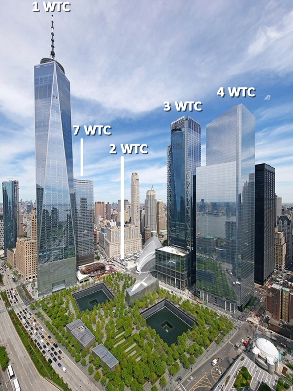 Le complexe du World Trade Center Le projet de réhabilitation du site comprend également plusieurs autres buildings, dont 3 sont terminés. Seven World Trade Center fut le premier à être reconstruit. Les travaux ont commencé dès 2002, peu après le déblayage des débris (l'ancien 7 WTC s'était effondré peu après les Twin Towers), pour s'achever en 2006. Il possède 52 étages, pour une hauteur de 228,6 mètres. Les dix premiers étages hébergent une station électrique fournissant de l'énergie pour le Lower Manhattan. Sa surface au sol, plus restreinte que le building original, a permis de rénover Greenwich Street dans le but de réunir le quartier de TriBeCa et celui du Financial District. Three World Trade Center (175 Greenwich Street, en face du 1 WTC et du mémorial) fut achevé le 19 avril 2018. Il compte 80 étages, culmine à 329 mètres. Four World Trade Center (150 Greenwich Street) atteint les 297,8 mètres de haut (72 étages). Il a été livré en 2013 après cinq ans de travaux. Quant au Two World Trade Center (200 Greenwich Street), sa construction est à l'arrêt au stade des fondations. Si le projet voit le jour, il devrait dépasser légèrement l'Empire State Building, avec une hauteur de 387 mètres (412 en haut de l'antenne) pour 81 étages. Un 6ème bâtiment, Five World Trade Center (130 Liberty Street) a été également autorisé en remplacement du building de 40 étages de la Deutsche Bank, trop endommagé pour être réparé, et dont la démolition s'est terminée en novembre 2009. L'étude est toujours en cours. Cliquer sur l'image pour l'agrandir. |