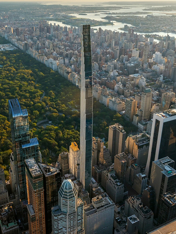 432 Park Avenue Plusieurs immeubles récents ont pour caractéristique une grande hauteur et une faible superficie au sol. C'est le cas du 432 Park Avenue qui tire son nom de son adresse sur la célèbre Park Avenue, au sud-est de Central Park. Cette tour carrée de 85 étages s'élève à 426 mètres pour une largeur de seulement 23 mètres ! Le bâtiment devait initialement culminer à 396 mètres, mais sa hauteur fut finalement augmentée d'une trentaine de mètres pour devenir, jusqu'à l'achèvement de la construction de la Central Park Tower (voir ci-dessous) le plus haut gratte-ciel résidentiel du monde, ainsi que la plus haute tour de New York au niveau du toit (avec 9 mètres de plus que le One World Trade Center !). Il est à ce jour (2022) la sixème structure la plus haute de la ville. L'architecte Rafael Vinoly a choisi de laisser deux étages vides tous les 12 étages afin de laisser passer les vents qui balaient la ville. Malgré l'amélioration des techniques de construction, et de la résistance du béton, le sommet du 432 Park Avenue subit encore par grands vents des oscillations de 60 centimètres à son sommet. Livrée fin 2015 après 4 ans de travaux, cette tour a nécessité la démolition, en 2007, du Drake Hotel, construit en 1926 et acquis pour la somme de 440 millions de dollars. Le coût de sa construction est évalué à 1,3 milliard de dollars. Elle abrite 104 luxueux appartements, du studio de 36 m² au pentahouse de 750 m². Vendu pour la somme record de 95 millions de dollars, cet appartement (un des plus hauts de la ville) comprend six chambres et sept salles de bain. Les habitants de l'immeuble ont par ailleurs accès à un restaurant avec jardin extérieur, un spa, une salle de gym, une piscine, une bibliothèque, une salle de billard, une salle de spectacle, une salle de jeux pour les enfants, ainsi qu'à un service de conciergerie et de valet. Cliquer sur l'image pour l'agrandir. |