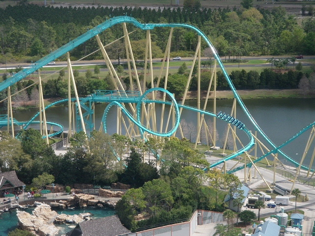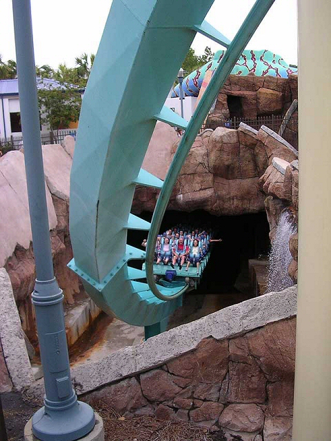 Kraken Kraken, inauguré en 2000, est un parcours de montagnes russes sans sol : les trains ne possèdent pas de planchers, les passagers étant maintenus par le siège et son harnais, les jambes flottant dans le vide. Elles font partie des plus hautes (45.4 mètres) d'Orlando, et sont à ce jour les plus rapides (104,6 km/h). Une des originalités de ce parcours de 1273 mètres, comprenant 7 inversions, est son passage dans un tunnel photo, sous le sol, après une descente de 44 mètres. Cliquer sur l'image pour l'agrandir. |