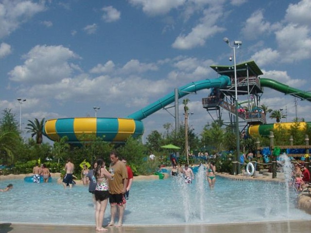Loggerhead Lane et Roa's Rapids La première est une lazy river ("rivière paresseuse") classique, où l'on s'installe dans des bouées et on se laisse porter par le courant. Roa’s Rapids est moins reposante, avec des méandres, un courant plus puissant et des jets d'eau. Cliquer sur l'image pour l'agrandir. |