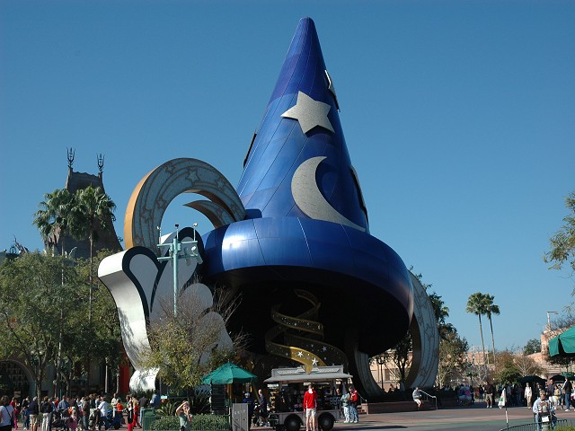 Le chapeau géant de Mickey L'emblème du parc était à l'origine le Mann's Chinese Theatre photo (le célèbre théâtre chinois de Los Angeles, sur Hollywood Boulevard). De la même taille que l'original, il sert d'entrée à l'attraction basée sur les films de la MGM, The Great Movie Ride. On entre d'abord dans une salle de cinéma, où sont diffusées de grandes scènes du cinéma américain. On continue par un parcours en petit train d'une vingtaine de minutes, où des automates plus vrais que nature rejouent les plus grands rôles de leurs modèles. Devant la façade sont reproduites dans le béton les empreintes de mains et de pieds des plus grandes stars d'Hollywood. Le théâtre est aujourd'hui masqué par une réplique géante du chapeau de l’apprenti sorcier Mickey dans Fantasia, qui a été installé en 2000 sur la place centrale du parc pour le 100ème anniversaire de la naissance de Walt Disney. Depuis, ce chapeau sert de symbole au parc, en remplacement du château d'eau photo aux oreilles de Mickey situé non loin de là. Cliquer sur l'image pour l'agrandir. |