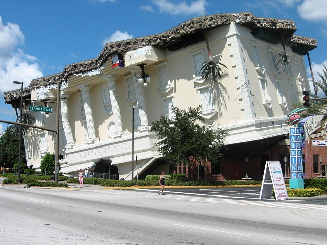 WonderWorks Le décor extérieur est spectaculaire (et gratuit !). Il s'agit d'un bâtiment de style temple grec, situé sur International Drive, qui serait en fait un laboratoire de recherches scientifiques secret basé dans le triangle des Bermudes. Il aurait été emporté par une mystérieuse tornade et se serait retrouvé sur le toit à Orlando, écrasant un entrepôt en briques. A l'intérieur se trouvent une centaine d'attractions très diverses : on peut se retrouver au cœur d'un ouragan, survivre à un tremblement de terre de magnitude 5,3 sur l'échelle de Richter, faire atterrir une navette spatiale, ... Pour en savoir plus : http://www.wonderworksonline.com/html/ (en anglais). Cliquer sur l'image pour l'agrandir. |