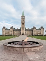 Le monument commémoratif de guerre du Canada Le Monument commémoratif de guerre du Canada, aussi appelé "La Réponse", est un grand cénotaphe de granit situé sur Confederation square, à l'angle sud-est des édifices du Parlement. Il symbolise le sacrifice de tous les membres des forces armées canadiennes qui œuvrent en temps de guerre pour sauvegarder la paix et la liberté. Ce monument funéraire est le lieu de la cérémonie nationale du Jour du Souvenir (le 11 novembre). Il fut dévoilé la première fois en 1939 en hommage aux Canadiens qui ont servi leur pays lors de la Première Guerre mondiale. Les dates de différentes guerres et missions ont depuis été ajoutées : deuxième guerre mondiale (1939-1945), guerre de Corée (1950-1953), guerre d'Afrique du Sud (1899-1902), Afghanistan (2001-2014). En 2000, la Tombe du Soldat inconnu a été installée devant le monument. Elle contient les restes d’un soldat canadien provenant d’un cimetière de guerre situé près de la crête de Vimy, en France. Cliquer sur l'image pour l'agrandir. |