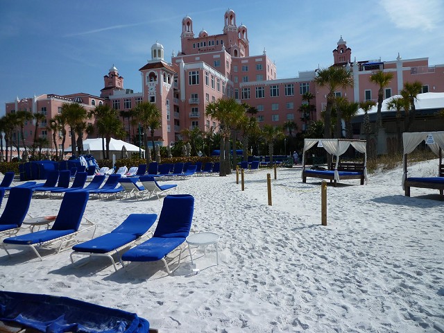 Don Cesar Beach Resort Le Don Cesar Beach Resort est un hôtel de luxe (connu comme "le Palace Rose de Floride") situé à St Petersburg Beach, au bord d'une plage de sable fin. C'est ici qu'en 1924, Thomas Rowe achète un terrain pour 100.000 dollars dans le but d'y construire un "château rose". Pour résoudre le problème de stabilité du bâtiment sur le sol sablonneux, le projet aurait nécessité l'enfouissement coûteux de nombreux pieux dans le sol. Construit dans le style renaissance méditerranéen et mauresque, il dispose d'ouvertures en arche, de balcons, et de tours. Le projet original de 450.000 dollars se compose d'un hôtel de six étages pour 110 chambres, mais le nombre de chambre sera finalement doublé, et le coût final triplé. L'hôtel ouvre le 16 janvier 1928 et devient rapidement un lieu apprécié des célébrités et des fortunés de l'époque. Il accueille ainsi l’écrivain Scott Fitzgerald, Al Capone ou encore Franklin D. Roosevelt. A la mort de Thomas Rowe, le bien est légué à sa femme mais il commence à péricliter. Lors de la Seconde Guerre mondiale, l'hôtel est vendu à l'armée pour 450.000 dollars pour être converti en hôpital en décembre 1942. En février 1944, l'hôpital est transformé en centre de convalescence de l'U.S. Air Force. En juin 1945, il est fermé et sert alors de bureau régional de l'administration des vétérans de guerre jusqu'en 1969. L'administration de l'armée souhaite abattre le bâtiment en piteux état mais c'était sans compter l'opposition des habitants locaux. En mars 1972, le bâtiment est vendu, et rouvre en temps qu'hôtel le 23 novembre 1973. En 1975, l'hôtel est ajouté au registre national des lieux historiques. Après de nombreux ajouts et rénovations de 1985 à 2001, dont un spa et une piscine, il est ensuite renommé en The Don Cesar Beach Resort and Spa. Son nom est un clin d'œil à Don Caesar DeBazan, le personnage principal de la pièce d'opéra Maritana de William Vincent Wallace. Cliquer sur l'image pour l'agrandir. |