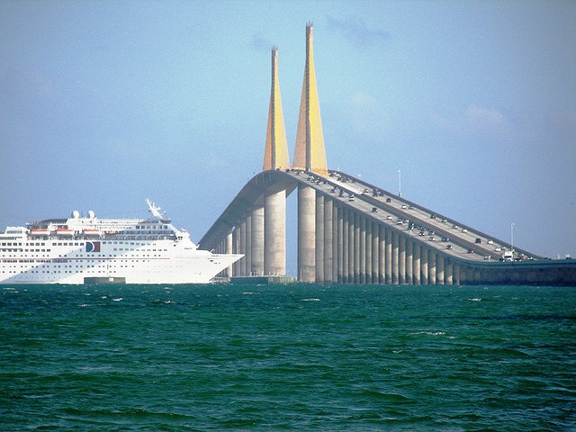 Sunshine Skyway Bridge La ville de Saint Petersburg est située sur une péninsule entre la baie de Tampa et le golfe du Mexique. Elle est reliée vers l’est à Tampa par trois ponts, et à Bradenton au sud par le Sunshine Skyway Bridge, qui traverse l’embouchure de la baie. Ce pont à péage, d'une longueur de 8860 mètres (1220 mètres pour le viaduc principal), a une hauteur de 73,5 mètres. Terminé en avril 1987, c'est un des plus longs ponts en béton de l'hémisphère nord. La route passe à 59 mètres au-dessus du niveau de l'eau, permettant ainsi à de gros navires de rentrer dans la baie. Les câbles métalliques qui le soutiennent ont été peints en jaune (en référence au surnom de l'état de Floride, Sunshine State, "l'état du soleil"). Il remplace les deux ponts métalliques parallèles) qui furent ouverts en 1954 pour le premier et 1971 pour le second. Heurté par un cargo en 1980, une partie d'un des ponts s'était effondrée, causant la mort de 35 personnes. L'ancien Sunshine Skyway Bridge fut démoli en 1990. Cliquer sur l'image pour l'agrandir. |