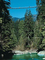 Capilano Suspension Bridge Situé au nord de Vancouver, Capilano Canyon fut creusé par la rivière du même nom. Un pont permet de le franchir, mais uniquement à pied. Il s'agit en effet d'une passerelle étroite de 137 mètres de long, suspendue à 70 mètres au-dessus de la rivière. Sa construction remonte à 1889. A l'époque, ce n'était qu'un pont de cordes, secondé en 1903 par un nouveau pont, en câbles métalliques cette fois, ce qui le rendait nettement plus sûr. Depuis 1956, les câbles en acier sont encastrés dans des blocs de béton de 13 tonnes placés sur chaque rive. A partir des années 1930, les Indiens de cette zone prirent l'habitude de planter des totems à proximité du pont. Quelques petits sentiers parcourent la forêt de l'autre côté du pont et permettent d'en apprendre un peu plus sur la faune et la flore des environs (le plus haut arbre d'Amérique du Nord était un pin Douglas, coupé en 1895 au nord de Vancouver : 127 mètres de haut, 24 mètres de circonférence). A cette attraction très courue, bien que relativement chère, est venu s'ajouter au printemps 2011 le Cliffwalk photo, une passerelle en arc-de-cercle de 50 centimètres de large, ancrée à la falaise en granit au dessus de la rivière Capilano. Pour en savoir plus : http://www.capbridge.com (en anglais). Cliquer sur l'image pour l'agrandir. |