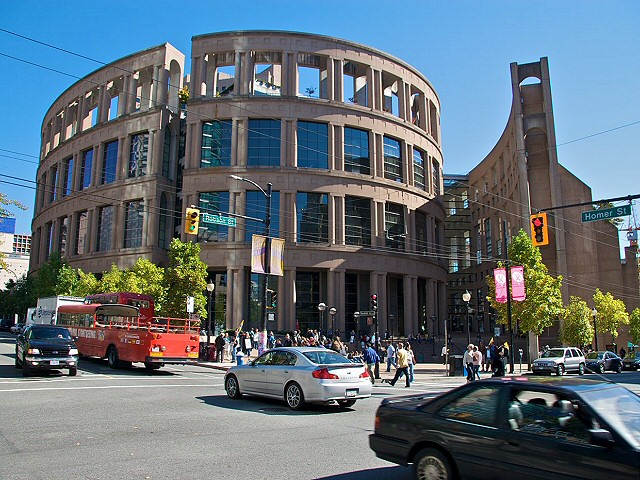 Robson Street Robson Street est la rue à la mode de Vancouver. Elle est bordée de restaurants internationaux (japonais, mexicains, californiens, ...), de boutiques de luxe européennes, ... Au bout de la rue se trouve un marché couvert où l'on vend des produits frais. A l'est de la rue se trouve la bibliothèque publique (photo ci-contre), ouverte en 1995, dont la construction coûta 100 millions de dollars (on la voit exploser dans le film "A l'aube du 6ème jour"). Le bâtiment, construit tout en pierres roses, s'inspire du Colisée de Rome, qu'il copie jusque dans ces parties manquantes. Située en plein centre de la ville, Robson Square est une zone piétonne sur plusieurs niveaux où l'on trouve également bon nombre de magasins et restaurants. Les bâtiments anciens et modernes se mêlent de façon harmonieuse dans ce quartier. L'hiver, tout comme Rockefeller Center à New York, Robson Square se transforme en patinoire. Cliquer sur l'image pour l'agrandir. |