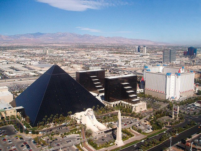 Hôtel Luxor Inauguré en octobre 1993, il comporte 4407 chambres et tire son nom de la ville de Louxor, en Egypte. La pyramide de 30 étages (106 mètres) s'inspire de la pyramide de Gizeh, en Egypte (qui culminait à 146 mètres). A l'intérieur, le plus vaste atrium photo du monde pourrait contenir 9 Boeings 747 empilés les uns sur les autres. On peut y voir quelques magnifiques représentations de statues et autres monuments d'Egypte, ainsi qu'un cinéma IMAX. Originalité de la pyramide : les ascenseurs suivent les pentes à 39 degrés du bâtiment. A l'extérieur, le Sphinx, grandeur nature, monte la garde devant l'obélisque. La nuit, au sommet de la pyramide, un puissant laser est envoyé dans le ciel. Les avions en vol peuvent l'apercevoir depuis Los Angeles, à 440 km de là, et il est paraît-il visible depuis l'espace ! Deux extensions de 22 étages ont été ajoutées en 2001. Le Luxor est relié au Mandalay Bay et à l'Excalibur par un monorail. Pour en savoir plus : http://www.luxor.com (en anglais). Cliquer sur l'image pour l'agrandir. |
