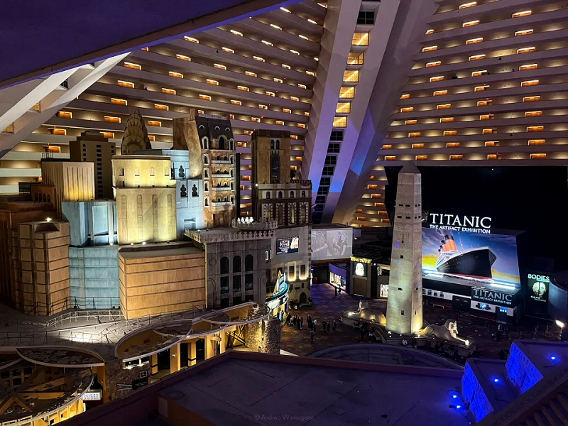 Hôtel Luxor Las Vegas Inauguré en octobre 1993, cet hôtel a pour thème l'Egypte antique, et tire son nom de la ville de Louxor. Il comporte 4407 chambres, réparties entre la pyramide de 30 étages mesurant 106 mètres de haut (à titre de comparaison, la pyramide de Khéops, près du Caire, culmine aujourd'hui à 138 mètres) et les deux tours annexes de 22 étages qui ont été rajoutées en 2001. Il fait ainsi partie du top 10 des plus grands hôtels du monde. Devant la pyramide se tient un imposant sphinx photo haut de 32 mètres, large de 24, et long de 80, réplique modernisée de celui de Gizeh, en encore plus grand. Toujours à l'extérieur, d'autres décors rappellent l'Egypte, comme les statues à tête de bélier à l'entrée du temple de Karnak, ou encore l'obélisque de 43 mètres de haut. A l'intérieur, l'immense atrium photo (le plus vaste au monde) pourrait contenir 9 Boeings 747 empilés les uns sur les autres. On peut y voir quelques magnifiques représentations de statues et autres monuments d'Egypte. Originalité de la pyramide : les chambres sont aménagées sur les parois inclinées, et surtout les ascenseurs suivent les pentes à 39 degrés du bâtiment. La nuit, au sommet de la pyramide, un puissant laser (Luxor Sky Beam) est projeté verticalement vers le ciel. Il est paraît-il visible à des centaines de kilomètres par les avions en vol. Le Luxor abrite plusieurs attractions uniques, dont Titanic : The Artifact Exhibition qui permet aux visiteurs de découvrir des objets récupérés sur l'épave du Titanic, et Bodies : The Exhibition, une exposition immersive sur l'anatomie humaine. Pour en savoir plus : http://www.luxor.com (en anglais). Cliquer sur l'image pour l'agrandir. |