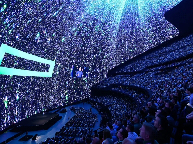 MSG Sphere Situé derrière le Venetian, le long de Sands Avenue, un nouveau bâtiment vient de faire son apparition, la MSG Sphere, qui avec ses 112 mètres de haut pour 157 mètres de diamètre est à ce jour le plus grand du monde en forme de sphère. Le 4 juillet 2023, l'allumage de l'écran de 54.000 mètres carrés qui la recouvre a fait le tour des réseaux sociaux, créant même des bouchons sur les autoroutes avoisinantes. 1,2 million de leds de la taille d'un palet de hockey projetteront tous les jours des animations en très haute résolution. La cérémonie de lancement de l'écran a impressionné les spectateurs, transformant par exemple la MSG Sphere en ballon de basket à l'effigie de la NBA pour célébrer le début de la ligue d'été, en œil géant photo ou encore en planète Terre. Initialement prévue pour 2021, la Sphère de Las Vegas a finalement ouvert fin septembre 2023, avec une série de concerts du groupe de rock U2. Car à l'intérieur se trouve une salle de spectacles pouvant accueillir 18.600 personnes en places assises et 20.000 personnes avec la fosse. La programmation sera aussi constituée de spectacles immersifs photo en 4D (157.000 haut-parleurs sont prévus, avec des sièges haptiques et un système de soufflerie et de diffusion de parfum). Enseigne publicitaire géante, elle était particulièrement visible lors premier grand prix de Formule 1 (si on ne tient pas compte des saisons 1981-82) en novembre 2023. La Madison Square Garden Company (du nom de la célèbre salle de spectacles New-Yorkaise), à l'origine de ce projet de 2,3 milliards de dollars, possède ses propres studios de production pour maîtriser toute la chaîne et proposer des contenus spécialement conçus pour la salle. En janvier 2026, Sphere Entertainment a annoncé l'ouverture d'une deuxième sphère aux Etats-Unis près de Washington, dans le Maryland. Il s'agirait d'une version plus compacte avec "seulement" 6000 places. D'autres projets de sphères sont à l'étude, à Abu Dhabi et Londres. Pour en savoir plus : http://www.thespherevegas.com (en anglais). Cliquer sur l'image pour l'agrandir. |
