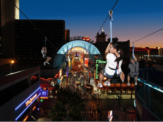 La Voodoo Zipline de l'hôtel Rio Cette tyrolienne relie les toits des deux bâtiments de l'hôtel Rio. Elle part du 50ème étage de la tour Masquerade et arrive au 20ème étage de la tour Ipanema. Le siège dans lequel deux personnes peuvent prendre place atteindra les 55 km/h. Cette attraction doit ouvrir au printemps 2014 et pourra s'effectuer de jour comme de nuit, à un tarif variable selon l'horaire. Pour en savoir plus : http://www.voodoozipline.com (en anglais). Cliquer sur l'image pour l'agrandir. |
