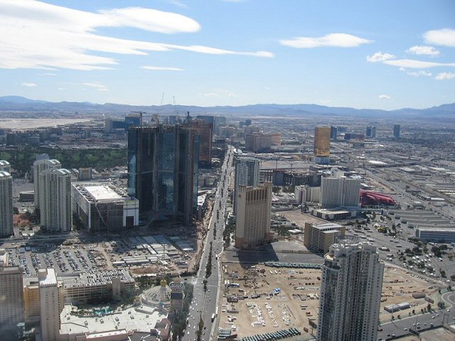 Vue générale du City Center Le projet du City Center est un complexe de bâtiments le long du Strip, inauguré le 16 décembre 2009. D'une superficie d'environ 44,5 hectares, il occupe l'emplacement rendu libre par la destruction du Boardwalk Hotel & Casino (le 9 mai 2006) avec, en plus, la partie située entre le Bellagio, le Cosmopolitan, le Monte Carlo, l'Interstate 15 et le Strip. Au plus fort de la construction, 8000 ouvriers ont travaillé sur le chantier. A la différence d'autres établissements à thème du sud du Strip, le City Center comprend plusieurs immeubles de grande hauteur et d'architecture contemporaine (voyez sur la photo comme le Monte Carlo - à gauche - apparaît maintenant petit à côté des nouveaux bâtiments). Les promoteurs ont employé des technologies écologiques afin d'en faire l'un des plus grands complexes au monde respectant le développement durable : terrasses-jardins, eau recyclée, centrale d'énergie locale. Il est relié au Bellagio et au Monte Carlo par un monorail photo. D'un coût total de 7,4 milliards de dollars (4 milliards à l'origine), le City Center s'annonce comme le plus grand investissement privé aux Etats-Unis. Au premier plan sur la photo du haut se trouvent de gauche à droite (le long du Strip) : le Mandarin Oriental Hotel (164 mètres de haut, 400 chambres d'hôtel et 227 appartements, presque tous vendus en 15 jours) ; les Veer Towers (deux tours de 129 mètres pour 37 étages et 337 appartements) ; le centre commercial The Crystals (avec commerces, boutiques de mode, restaurants haut de gamme et galeries d'art) ; le Harmon Hotel & Residences (une tour de 27 étages qui devrait être démolie en 2014, des défauts de conception - certains de ses piliers seraient mal placés, tandis qu'il en manquerait d'autres pour soutenir la structure - font que la tour pourrait s'écrouler en cas de tremblement de terre). Pour en savoir plus : http://www.citycenter.com (en anglais). Cliquer sur l'image pour l'agrandir. |